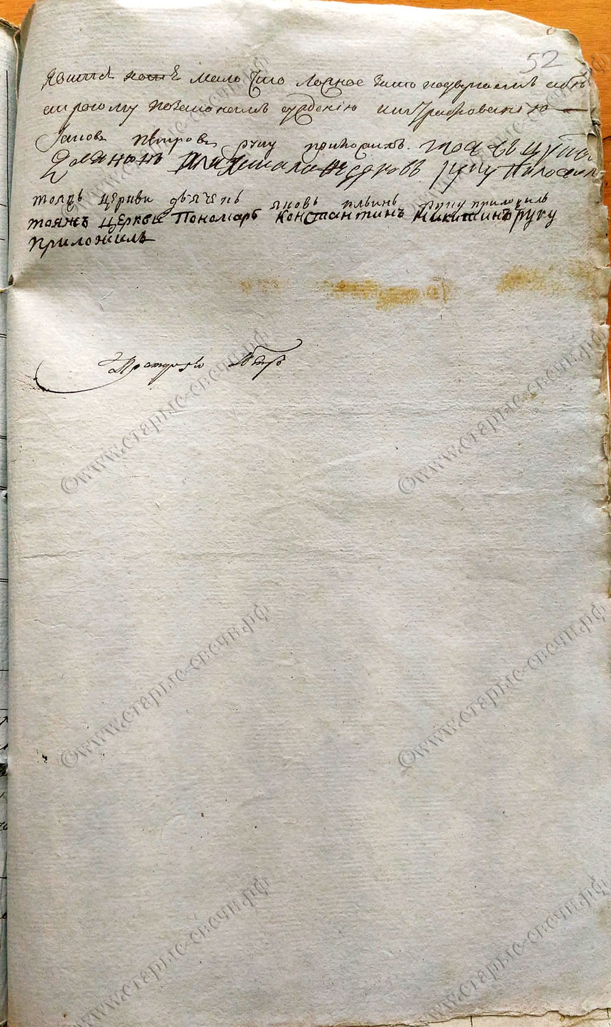 По причине неграмотности вместо понятых посторонних людей, чьи межи[?] значатся в …… книге, по их личной просьбе подписался канцелярист Дмитрий Черкасский».