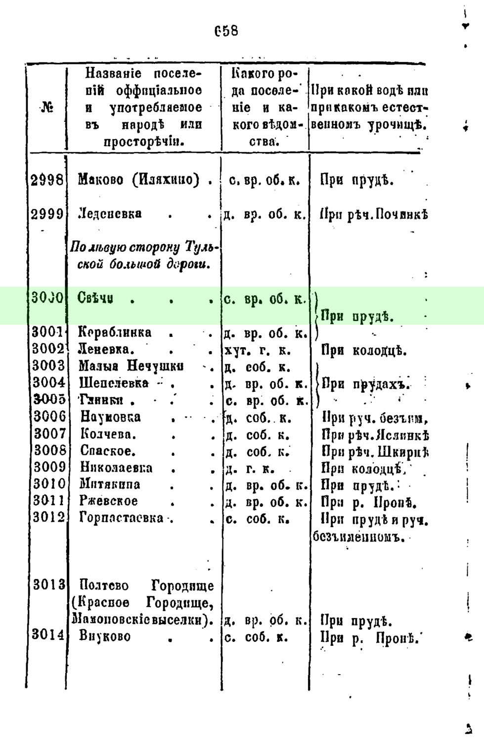 Как было показано выше, согласно Уставной грамоте помещика П. П. Таптыкова переселение крестьян на новое место – в будущую деревню Новые Свечи – планировалось начать с 1868 года. Поэтому в Памятной книжке на 1868 год село
