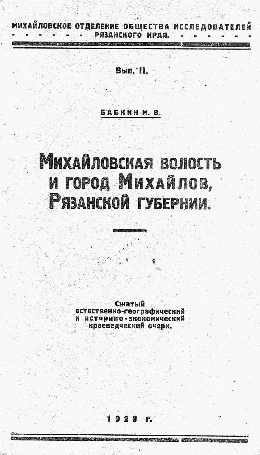 Михайловская волость и город Михайлов Рязанской губернии. Сжатый естественно-географический и историко-экономический краеведческий очерк / Бабкин М. В., 1929.