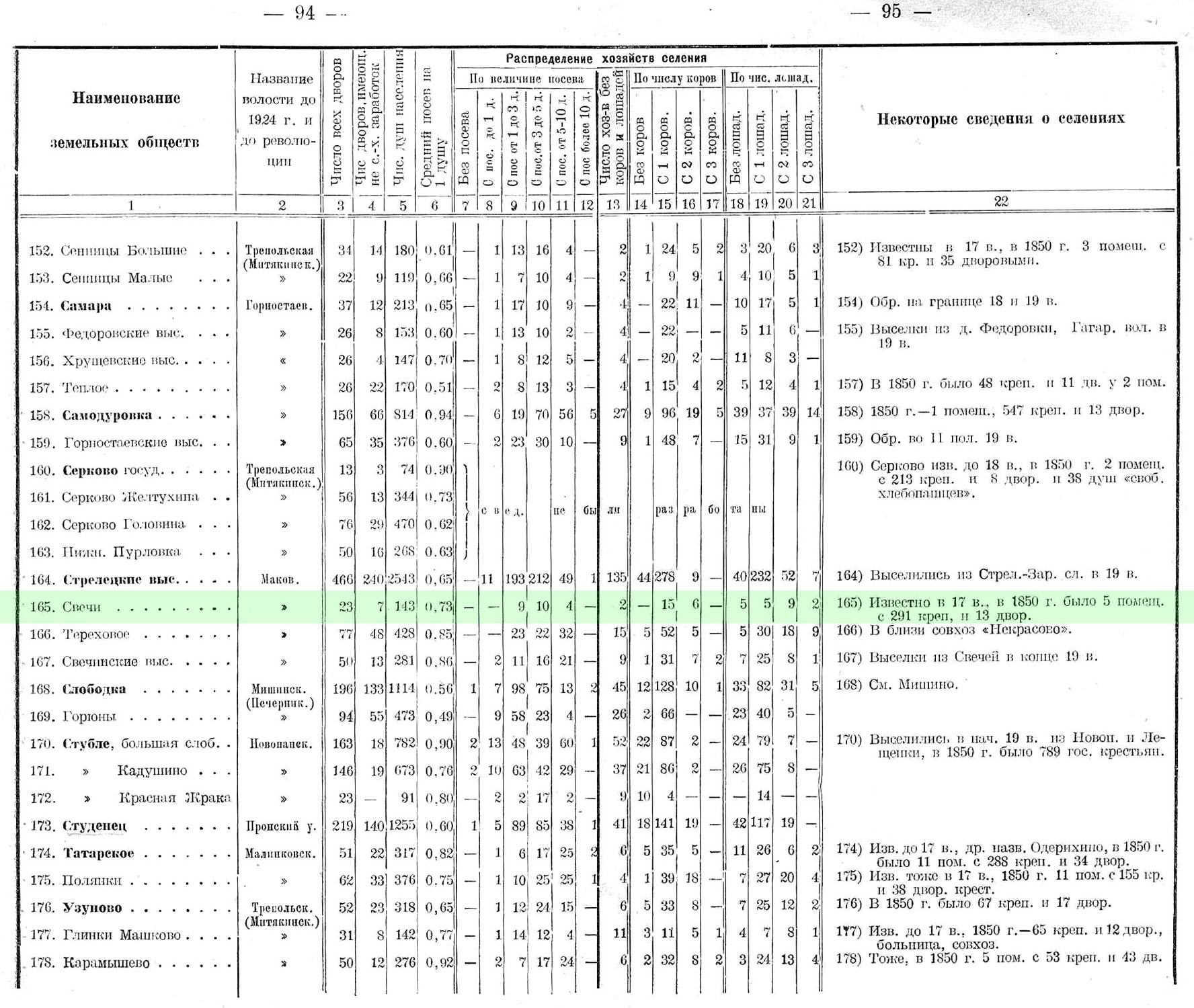 Так, на 1928 год в Свечах в общей сложности в 23 дворах проживало уже 143 человека. Каждая семья засевала порядка 4 га. Ни коров, ни лошадей не было у 2-х семей, остальные кого-то держали: 15 семей – по одной корове, 6 семей – по две коровы, лошади были у 16 семейств, из них 5 семей держали по одной лошади, 9 семейств по две и у 2-х семейств было по три лошади.
