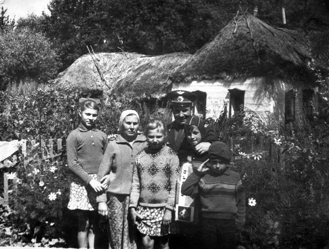 Дом Домны Петровны, 1968 г. Перед ним – Полина Васильевна Иванова с сыном Евгением, внучками Таней и Галей, внуками Юрием и Виктором