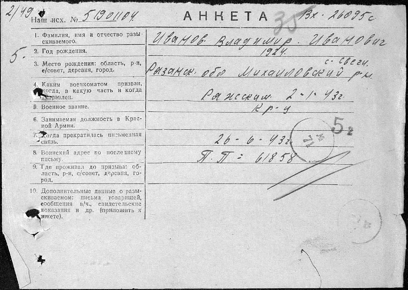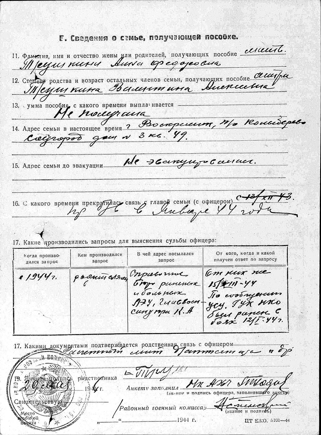 Направлен в действующую армию. Пропал без вести в январе 1942 г., писем не было.