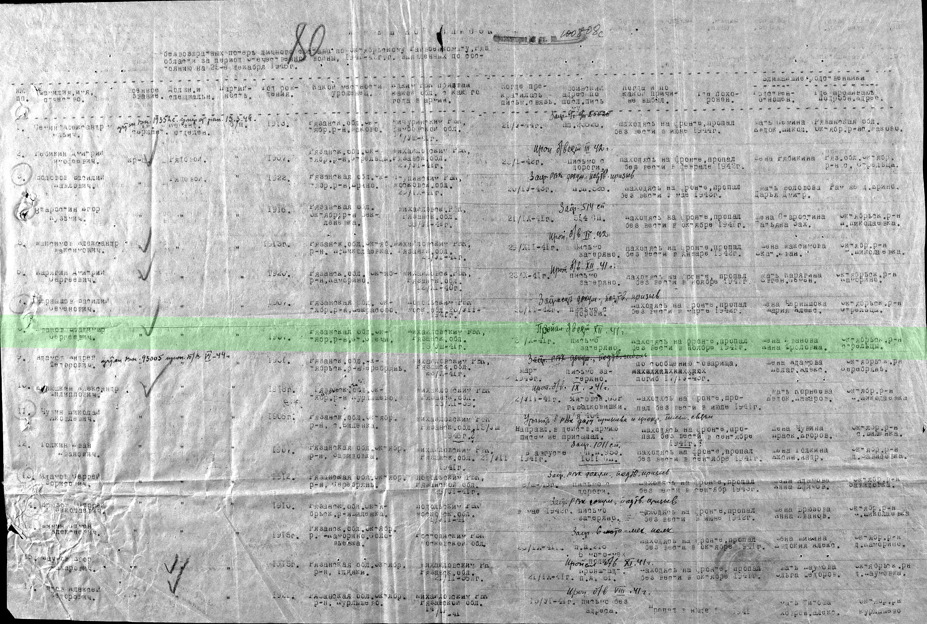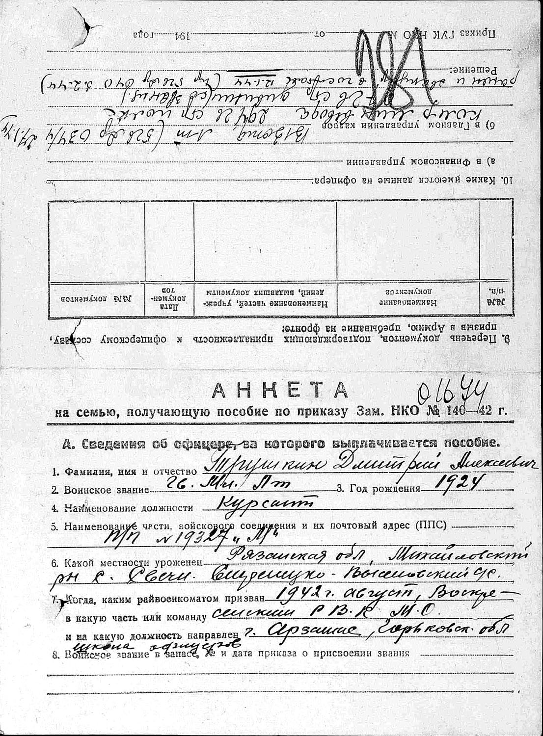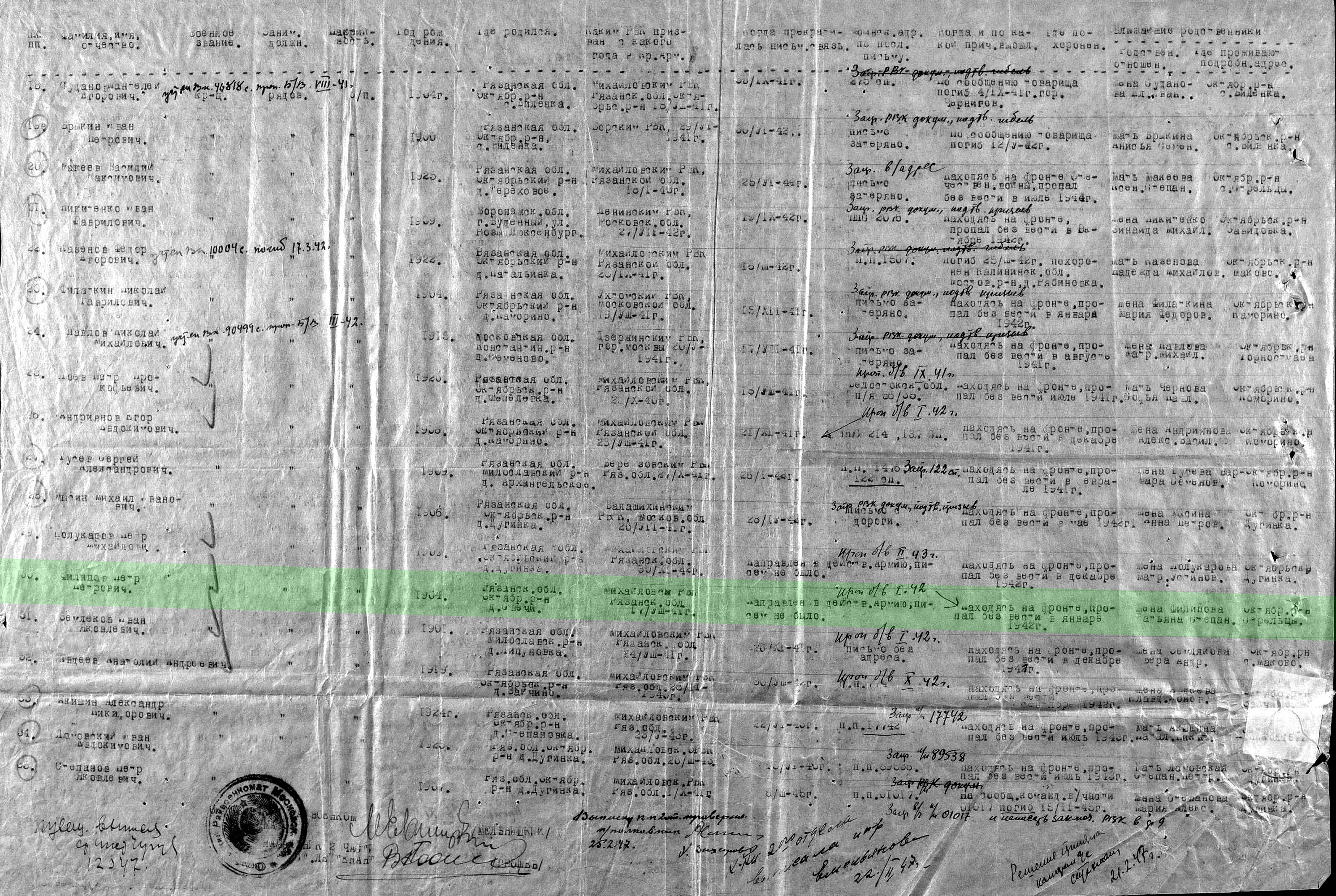 Участник Великой Отечественной войны, рядовой, призван 17.08.1941 Михайловским РВК Рязанской обл.