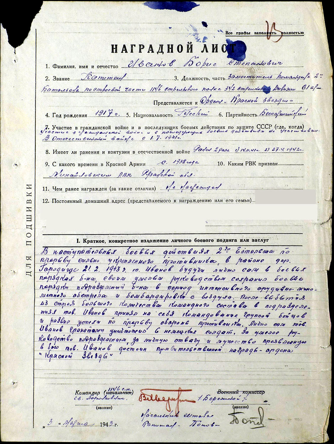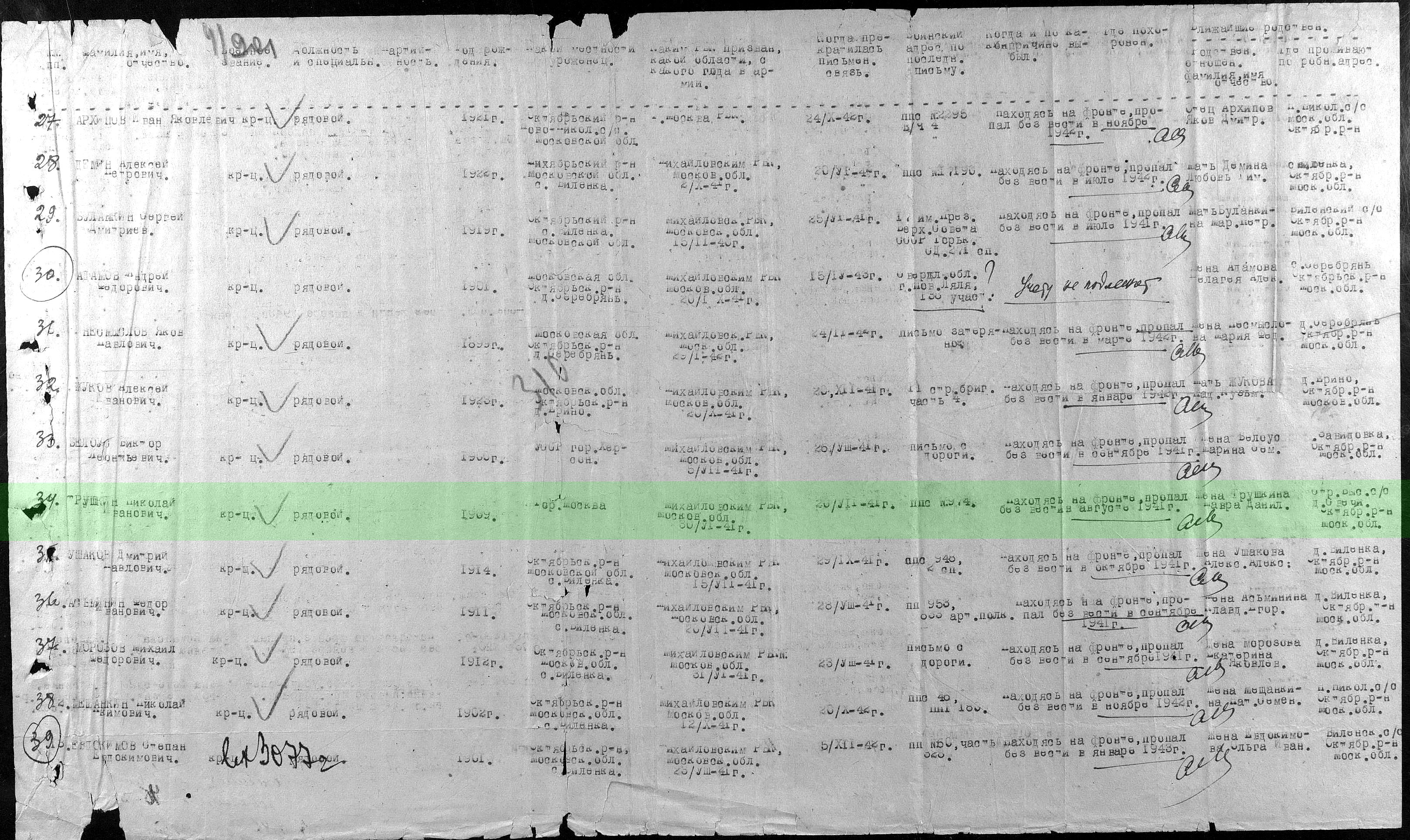 Участник Великой Отечественной войны, рядовой, призван 10.09.1941 Октябрьским РВК Московской обл.